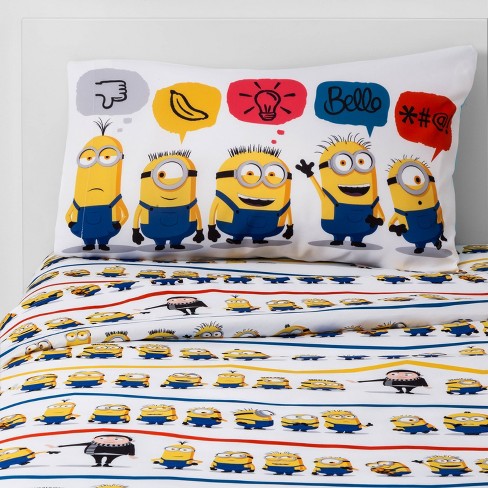Check out our minions bedding set selection for the very best in unique or custom, handmade pieces from our shops. The sheet set includes one twin fitted bottom sheet, one flat top sheet and one colorful reversible minion pillowcase. This set include comforter, duvet cover, flat sheet and pillow case all 4pcs. Make it the ultimate minions room by adding the coordinating curtains and wall accents one twin fitted sheet. , despicable me minions at work twin size flat sheet, fitted sheet, and one standard pillowcase., genuine licensed merchandise., machine washable., cotton rich!, 60% cotton, 40% polyester.